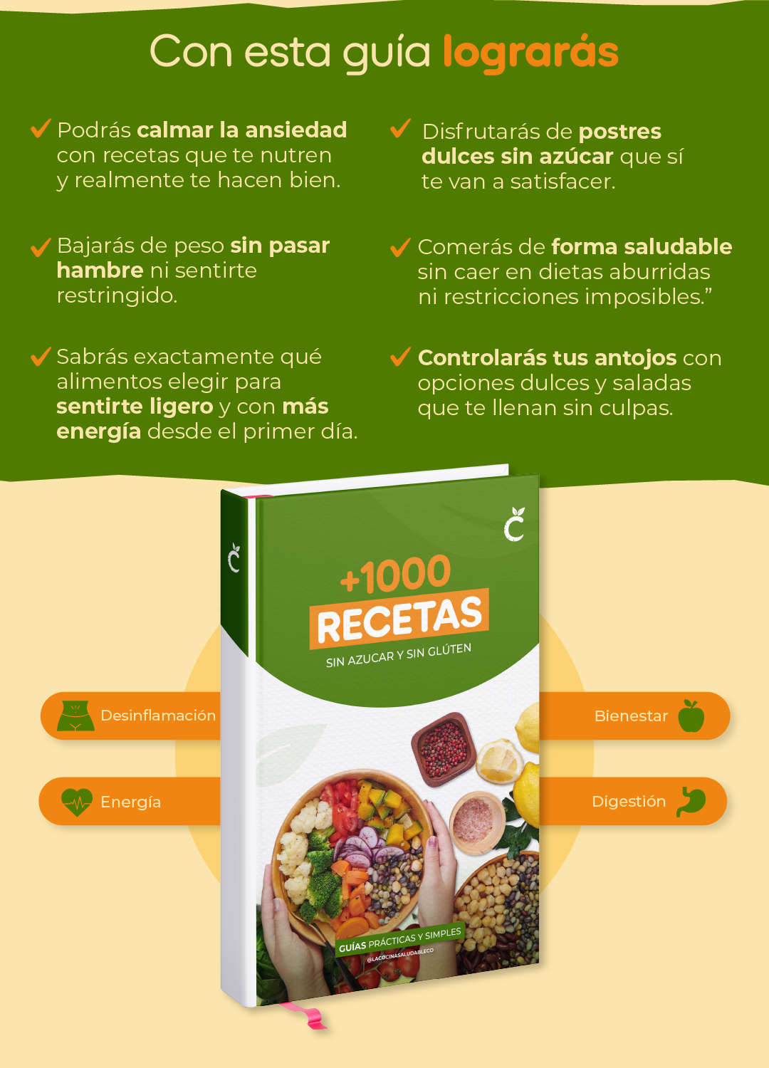 Este recetario es sin gluten y sin azúcar, pero no está pensado como material médico. Si tienes una condición específica, siempre es ideal consultar con tu profesional de salud de confianza.