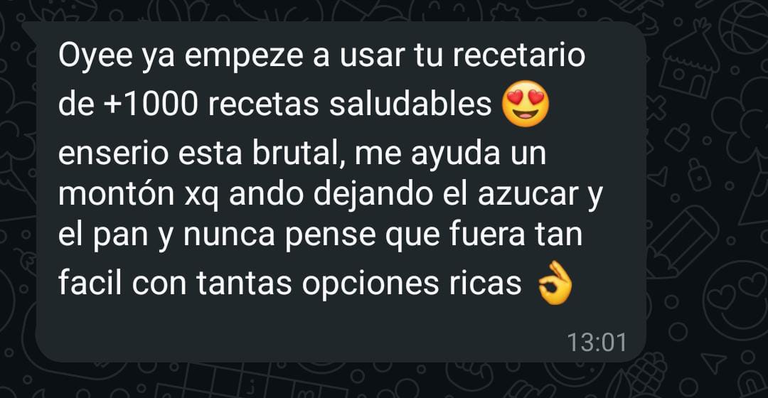 Después de hacer tu compra, te llega un correo automático con el acceso al recetario digital. Es un archivo en PDF que puedes ver desde tu celular, computador o imprimir si quieres tenerlo a mano en la cocina.